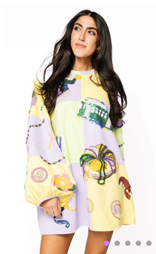 Queen of Sparkles Checkered Mardi Gras Icon Balloon Sleeve Dress