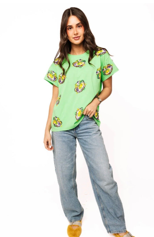Mardi Gras Color Block Sequined Fleur de Lis Short Sleeve Top