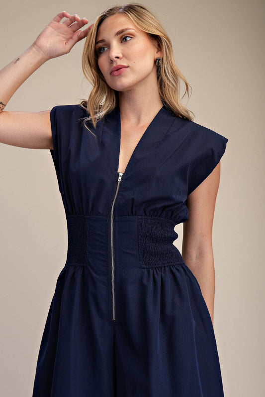 Navy Cap-Sleeve Smocked Front-Zip Jumpsuit