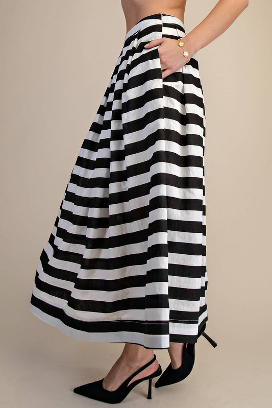 Black and White Stripe Full Pleated Midi Skirt
