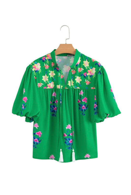 Green Floral Split Neck Puff Sleeve Blouse