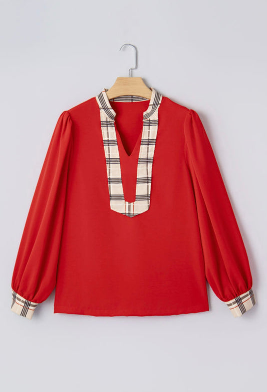 Green Plaid V Neck Collared 3/4 Sleeve Blouse