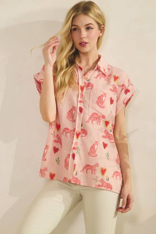 Pink Tiger Print Button Down Shirt