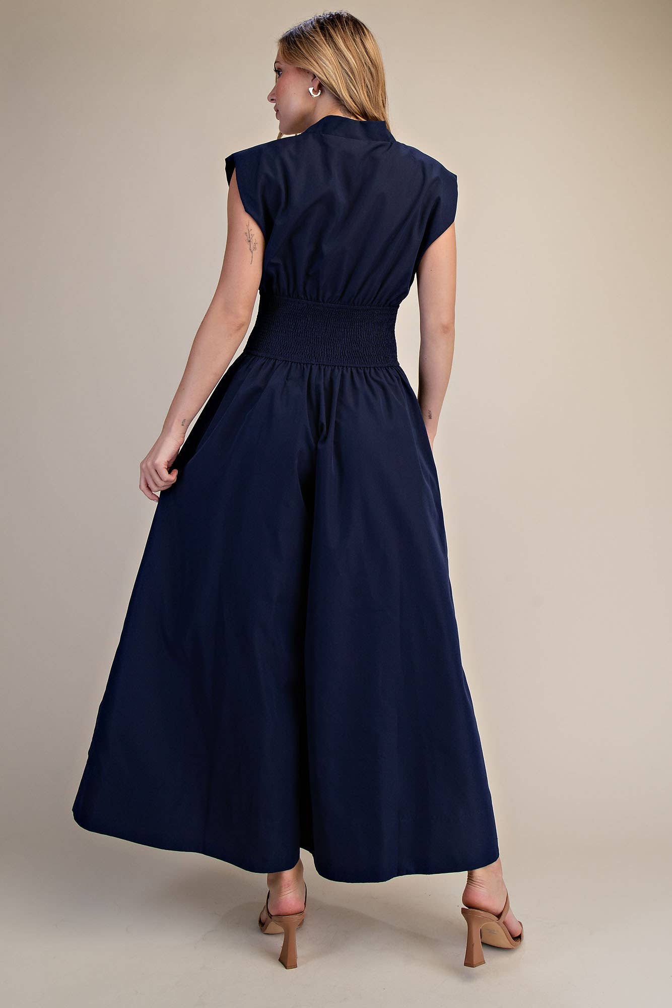 Navy Cap-Sleeve Smocked Front-Zip Jumpsuit